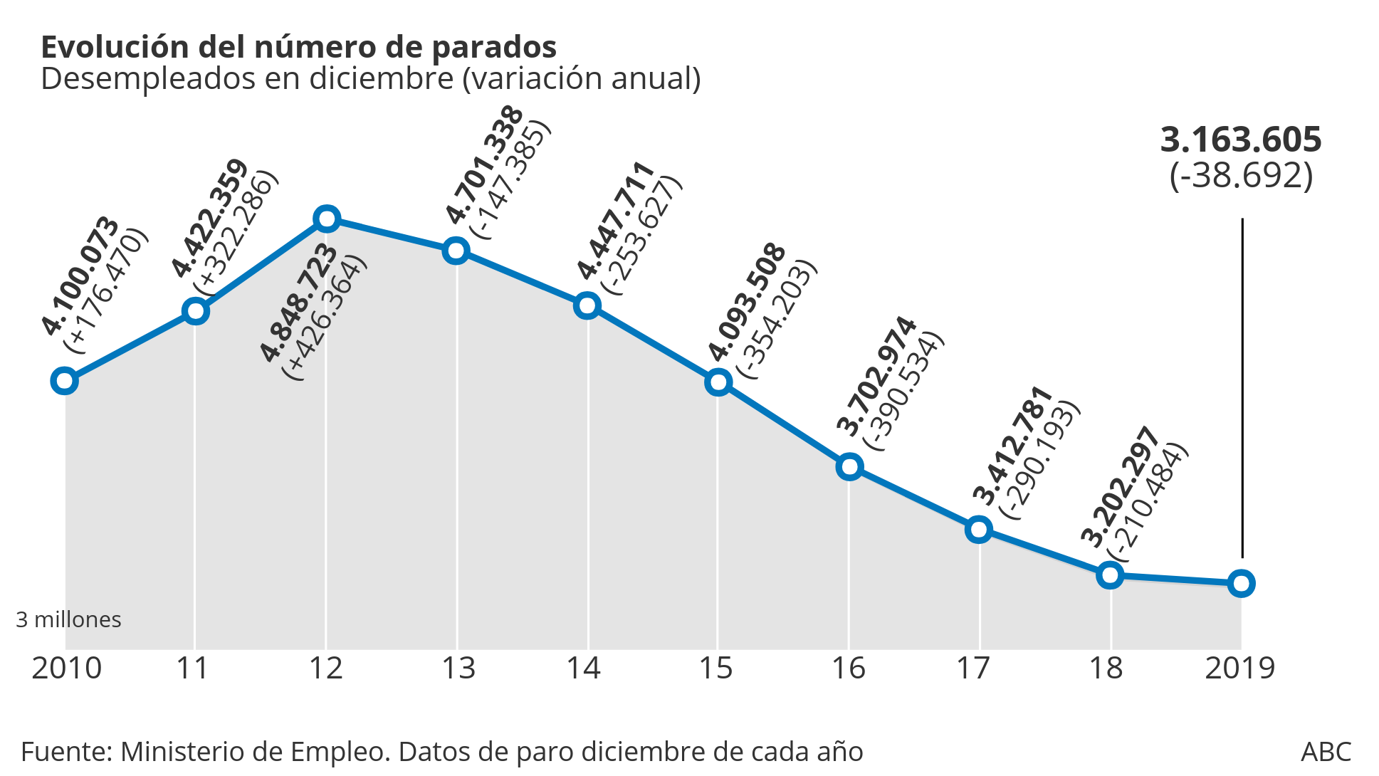 Количество безработных, зарегистрированных в офисах государственных служб занятости Испании на конец декабря 2019 года, снизилось за месяц на 34.579 человек (-1,08%), согласно данным, представленным вчера Министерством занятости и социальной защиты (Ministerio de Empleo y Seguridad Social). Указанный показатель стал самым худшим для этого месяца с 2011 года, когда работы лишились 1.897 человек.
