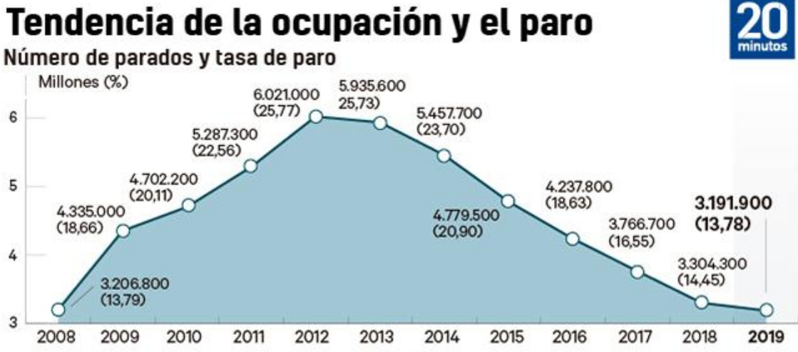 По состоянию на конец 2019 года уровень безработицы в Испании снизился до 13,78% от числа экономически активного населения. Это самый низкий показатель с конца 2008 года. В 2018 году этот показатель составлял 14,45%.