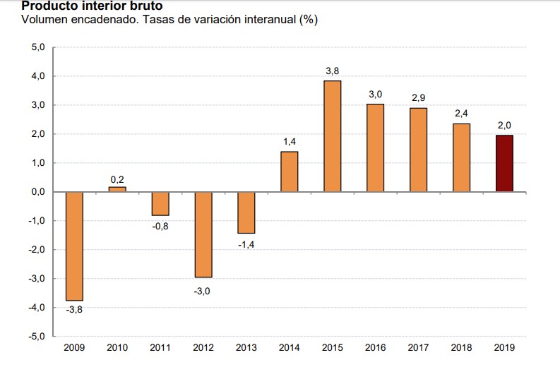 Валовый внутренний продукт (ВВП) Испании вырос в годовом выражении на 2,0% в 2019 году, что на 0,4% меньше, чем в 2018-м согласно предварительным данным, опубликованным сегодня Национальным институтом статистики (INE). Рост экономики Испании в прошедшем году стал самым низким с 2014 года, что соответствует ухудшению ожиданий глобального роста.