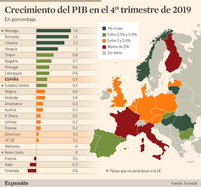 В этом контексте экономика Испании IV квартале 2019 года вернулась к лучшим показателям, зарегистрированным среди крупнейших стран в Европе, с ростом на 0,5%, и стала единственной, которая ускорила темпы развития по сравнению с предыдущим кварталом (+0,4%).