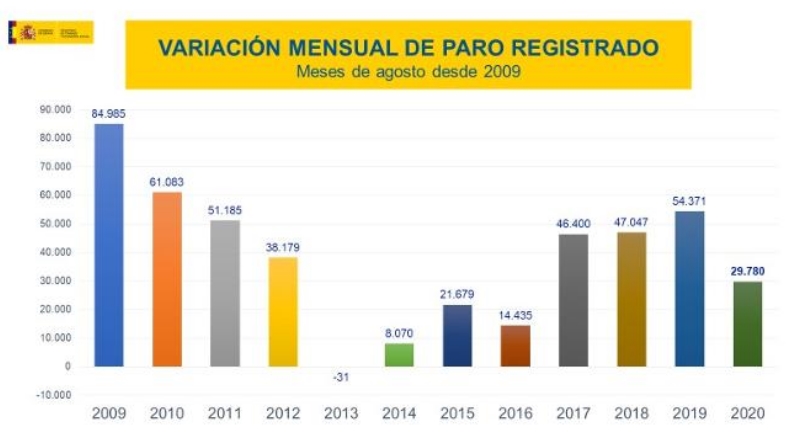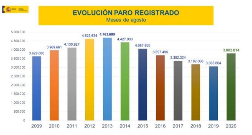 Количество безработных, зарегистрированных в офисах государственных служб занятости Испании на конец августа 2020 года, увеличилось за месяц на 29.780 человек (+0,79%), согласно данным, представленным сегодня Министерством занятости и социальной защиты (Ministerio de Empleo y Seguridad Social). Этот рост безработицы оказался самым низким для августа с 2016 года, когда число безработных увеличилось на 14.435 человек.