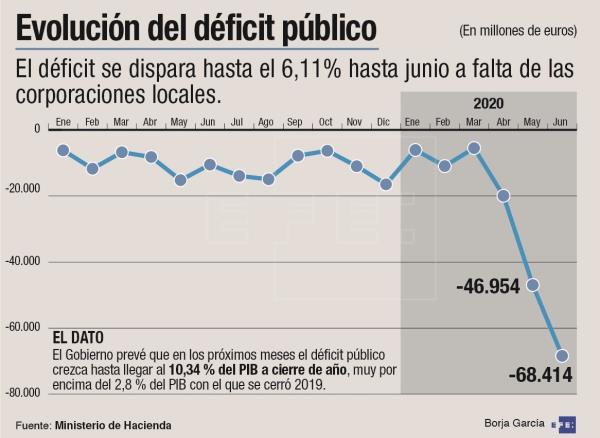 Потеря доходов и увеличение расходов на борьбу с пандемией COVID-19 привели к росту государственного дефицита Испании в июне текущего года до 6,11% ВВП (68,414 млрд. евро), что в три раза больше, чем год назад 2,07% ВВП (25,728 млрд. евро).