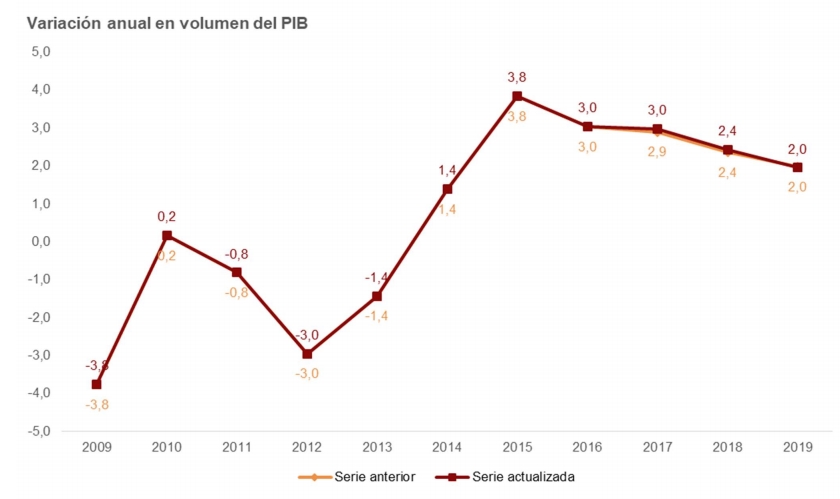 В текущих ценах годовой рост ВВП в 2019 году составил 3,4%, что на две десятых меньше, чем в предыдущей оценке, и составил 1.244.772 млн. евро. Рост неявного дефлятора экономики также пересмотрен в сторону понижения на две десятых, до 1,4%, с 1,6% ранее.