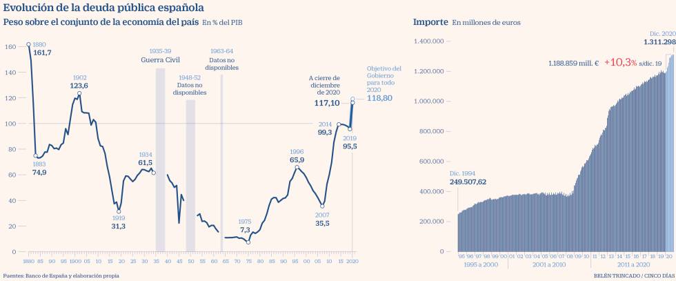 Согласно данным, опубликованным в вчера Банком Испании, долг государственных администраций в целом по итогам 2020 года составил 1.311.298 миллионов евро, что эквивалентно 117,1% номинального ВВП за весь 2020 год (1.119.976 миллионов евро).Подобное соотношение госдолга к ВВП является самым высоким показателем для страны с 1902 года, когда от составил123,6% ВВП.