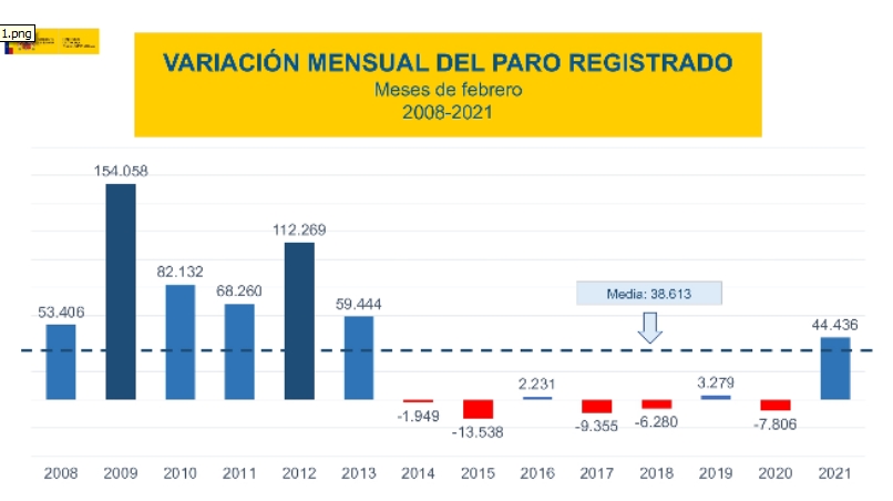 По итогам февраля 2021 года число безработных, официально зарегистрированных в органах государственной службы занятости Испании, увеличилось на 44.436 человек (+1,12%), по сравнению с предыдущим месяцем. Министерство труда и социальной экономики Испании, опубликовавшее сегодня эти данные, отмечает, что февральский рост числа безработных текущего года является максимальным для этого месяца с 2013 года (+ 59 444 человека).