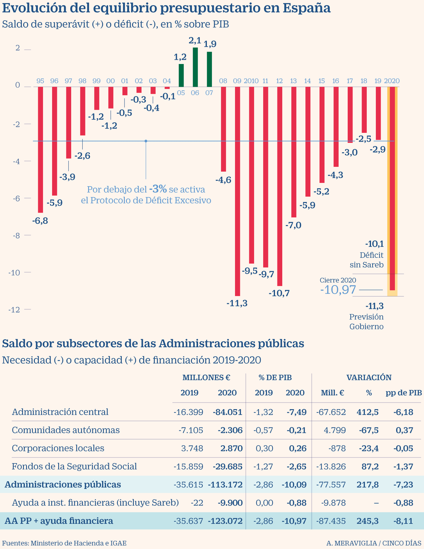 В целом по Испании дефицит государственного управления составил в 2020 году 113,172 млрд. евро или 10,09% ВВП, что почти в четыре раза превышает показатель 2019 года (2,86% ВВП) и достиг наивысшего уровня с 2009 года (11,06% ВВП).