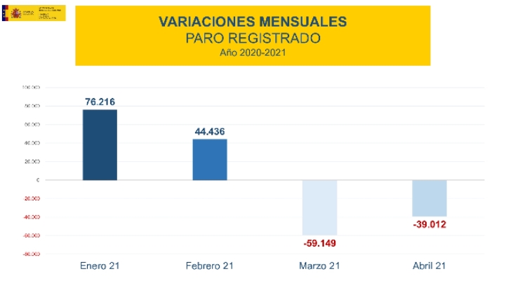По итогам апреля 2021 года число безработных, официально зарегистрированных в органах государственной службы занятости Испании, снизилось на 39.012 человек (-0,99%), по сравнению с предыдущим месяцем, что является наибольшим снижением в этом месяце с 2012 года, когда было снижение на 6.632 человека.