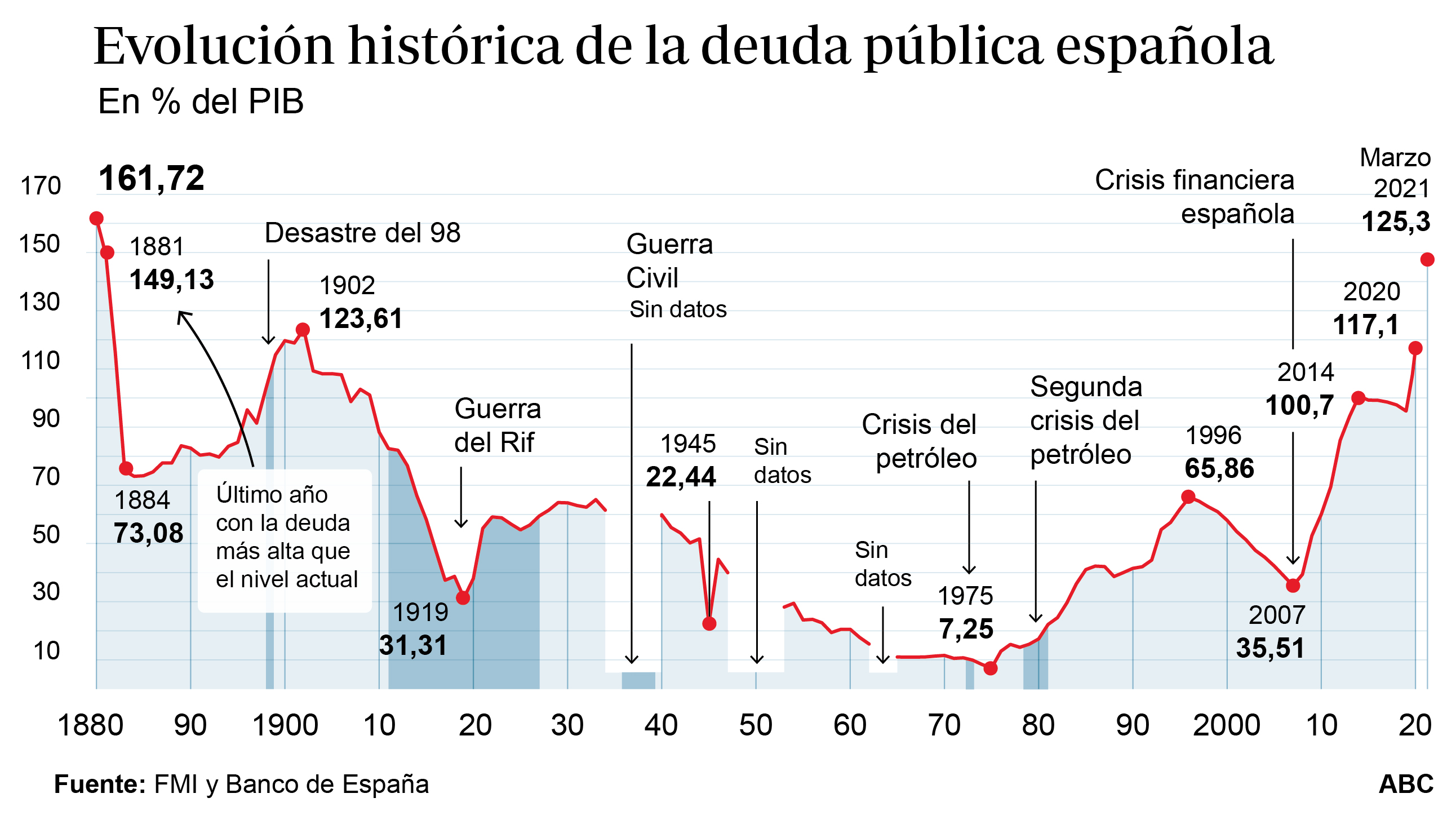 Долг всех государственных администраций Испании увеличился за один месяц на 25,726 млрд. евро в марте 2021 года и составил 1.392,696 миллиардов евро (125,3% ВВП), что является новым историческим максимумом, согласно данным, опубликованным вчера Банком Испании. Показатель задолженности страны достигает самого большого уровня за последние 140 лет, когда в 1881 году он немного превысил 149% ВВП.