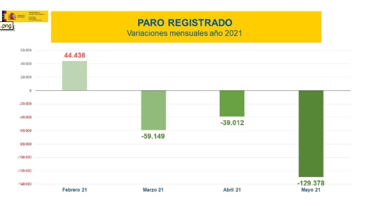 По итогам мая 2021 года число безработных, официально зарегистрированных в органах государственной службы занятости Испании, снизилось на 129.378 человек (-3,31%), по сравнению с предыдущим месяцем, что является наибольшим месячным снижением за всю историческую серию, начавшуюся в 1996 году.