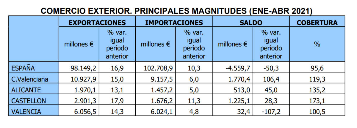 Экспорт из Валенсийского сообщества вырос на 15% за первые четыре месяца 2021 года, составив 10.927,9 миллиона евро (11,1% от общего объема экспорта Испании), согласно данным, опубликованным Управлением торговли Валенсийского сообщества.