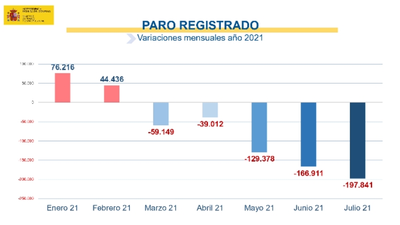 По итогам июля 2021 года число безработных, официально зарегистрированных в органах государственной службы занятости Испании, снизилось на 197.841 человек (-5,47%), по сравнению с предыдущим месяцем, что является наибольшим месячным снижением за всю историческую серию, начавшуюся в 1996 году. Предыдущий рекорд был установлен в июне текущего года, когда зарегистрированная безработица снизилась за месяц на 166.911 человек.