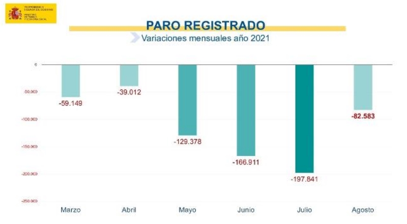 По итогам августа 2021 года число безработных, официально зарегистрированных в органах государственной службы занятости Испании, снизилось на 82.583 человек (-2,42%), по сравнению с предыдущим месяцем, что является наибольшим месячным снижением в августе за всю историческую серию, начавшуюся в 1996 году.