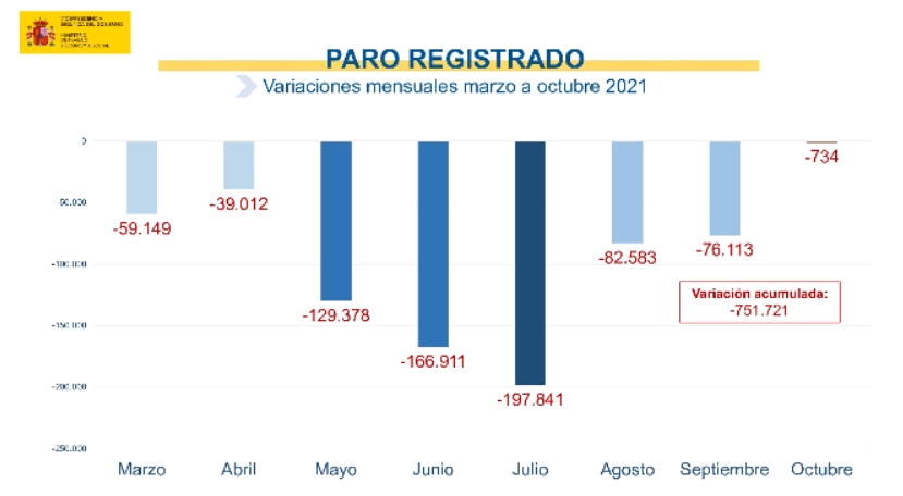 По итогам октября 2021 года число безработных, официально зарегистрированных в органах государственной службы занятости Испании, снизилось на 734 человек (-0,02%), по сравнению с предыдущим месяцем, что является первым снижением безработицы в октябре месяце, начиная с 1975 года.