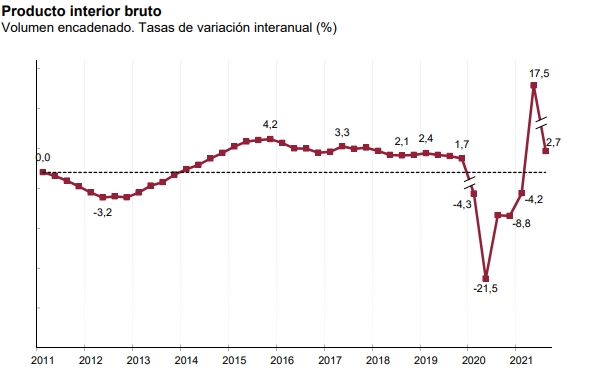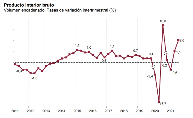 Согласно предварительным данным Национального бухгалтерского учета, опубликованным сегодня Национальным институтом статистики (INE), в третьем квартале 2021 года экономика Испании выросла в квартальном выражении на 2,0% после роста на 1,1% во втором квартале и падения на 0,6% в первом квартале.