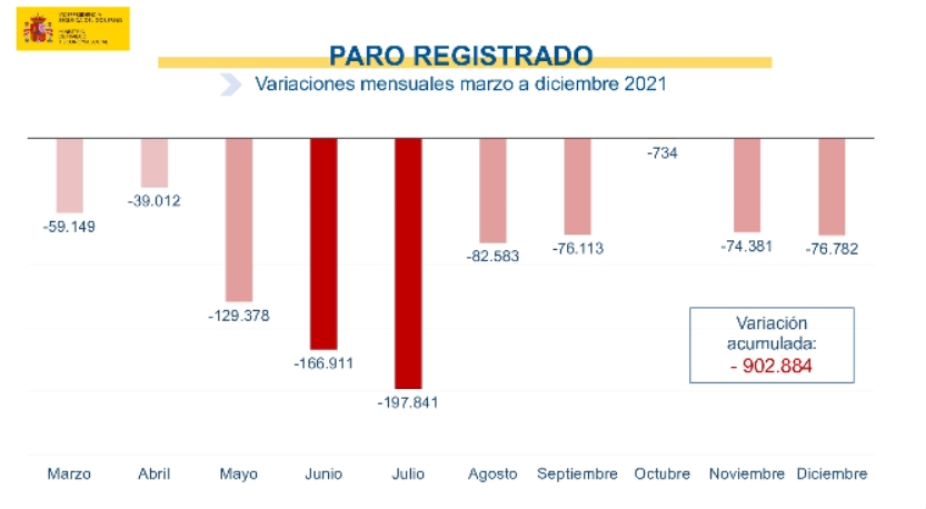 По итогам декабря 2021 года число безработных, официально зарегистрированных в органах государственной службы занятости Испании, снизилось на 76.782 человека (-2,41%), по сравнению с предыдущим месяцем.