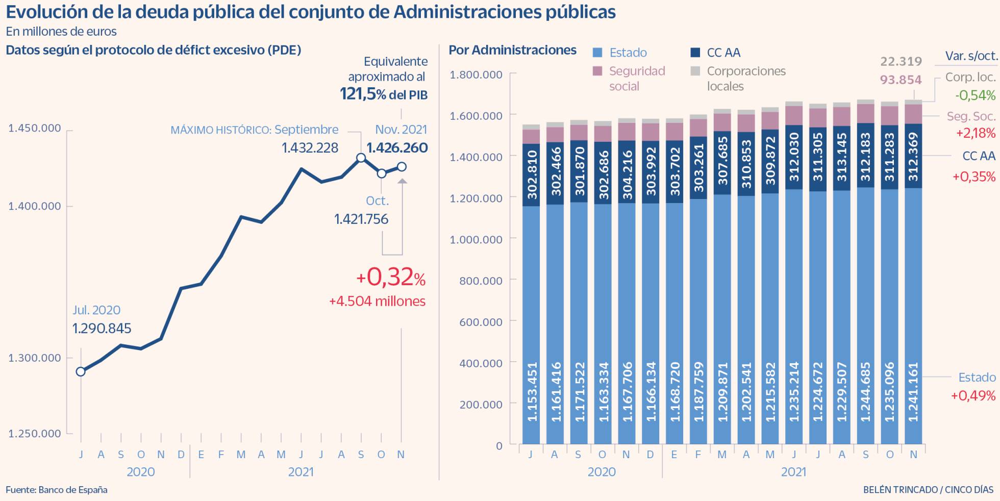 Банк Испании опубликовал состояние долга всех органов управления страны, который составил в ноябре 2021 года 1.426 миллиардов евро, что эквивалентно примерно 121,5% ВВП. Этот процент серьезно угрожает достижению цели, установленной исполнительной властью на весь год в размере 119,5% ВВП.