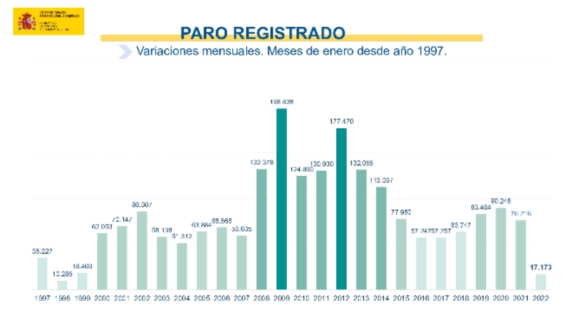 По итогам января 2022 года число безработных, официально зарегистрированных в органах государственной службы занятости Испании, выросло на 17.173 человека (+0,5%), по сравнению с предыдущим месяцем, что является самым низким ростом в этом месяце с 1998 года, когда безработица увеличилась на 10.285 человек.