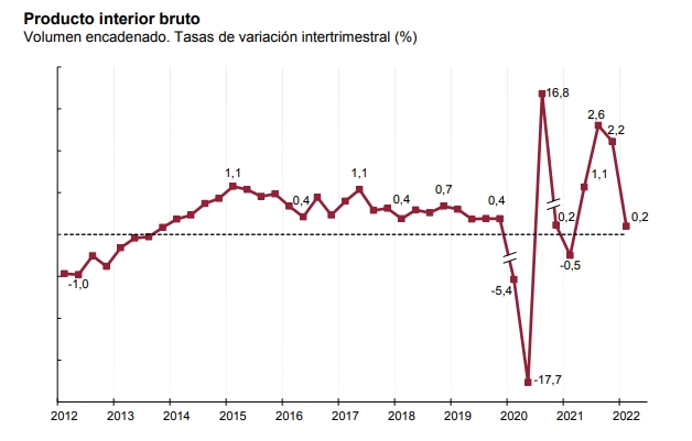 Согласно окончательным данным, опубликованным сегодня Национальным институтом статистики (INE), экономика Испании в первом квартале 2022 года выросла на 0,2%, по сравнению с предыдущим кварталом. Это самый низкий квартальный показатель роста с первого квартала 2021 года, когда экономика упала на 0,5% в разгар второй волны пандемии.