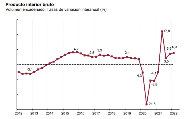 В годовом исчислении экономика Испании выросла на 6,3% (+6,4% по предварительным данным). В четвёртом квартале 2021 года годовой рост ВВП составило 5,5%.
