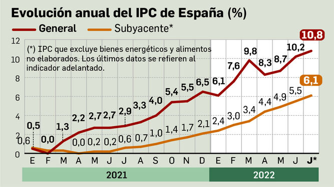 В Испании инфляция составила в июле 2022 года 10,8% по сравнению с 10,2% в июне и 2,9%, -в июле 2021 года.