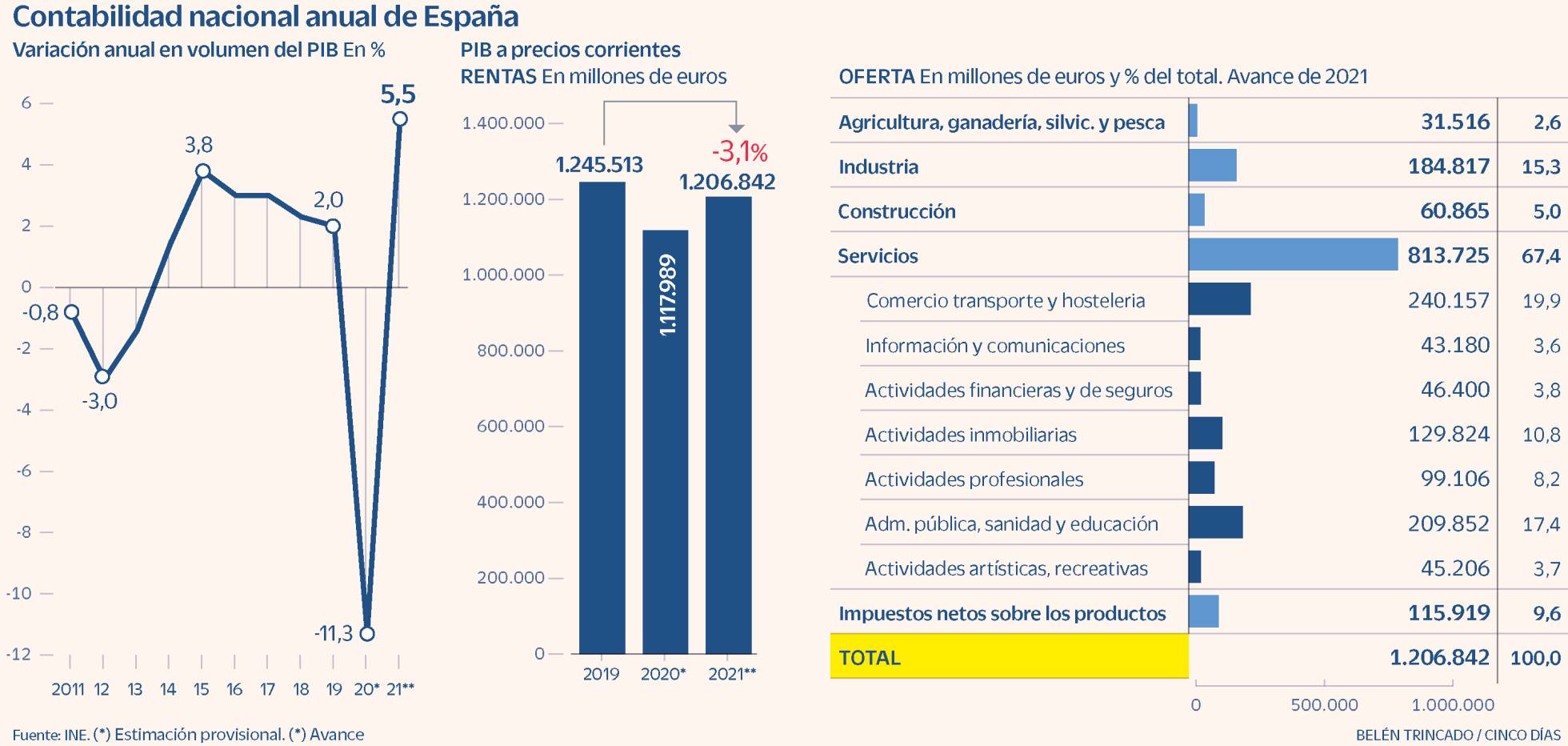Национальный институт статистики (INE) пересмотрел рост экономики Испании в 2021 году в сторону повышения с 5,1% до 5,5% из-за большего вклада внутреннего спроса, в том числе, в результате увеличения потребления домохозяйств выше, чем предполагалось ранее.