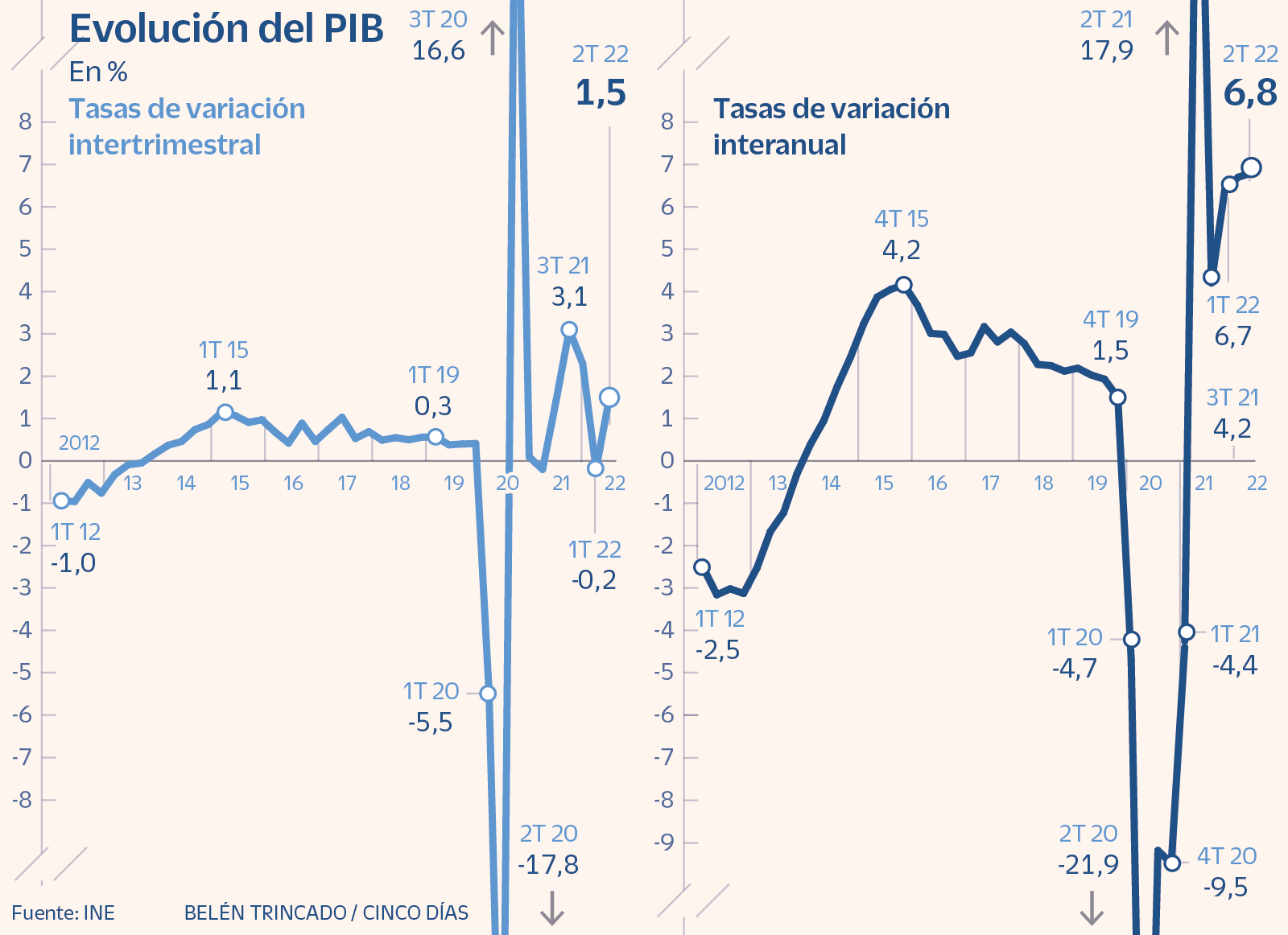 ВВП в текущих ценах составил во втором квартале 2022 года 323,810 миллиарда евро, что представляет собой самый высокий квартальный показатель в историческом ряду INE, что на 5,151 миллиард больше, чем в первом квартале, и на 31,013 миллиард больше, чем во втором квартале 2021 года.