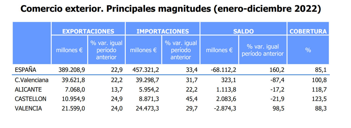 Валенсийская автономия закрыла 2022 год с новым историческим показателем объёма продаж своей продукции за рубеж, который составил €39,622 млрд. евро, что на 22,2% больше, чем в 2021 году. Такие данные были представлены Территориальным управлением торговли (ICEX).