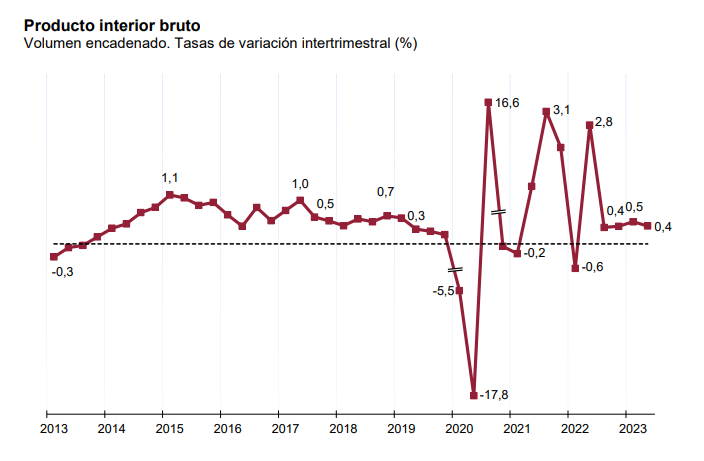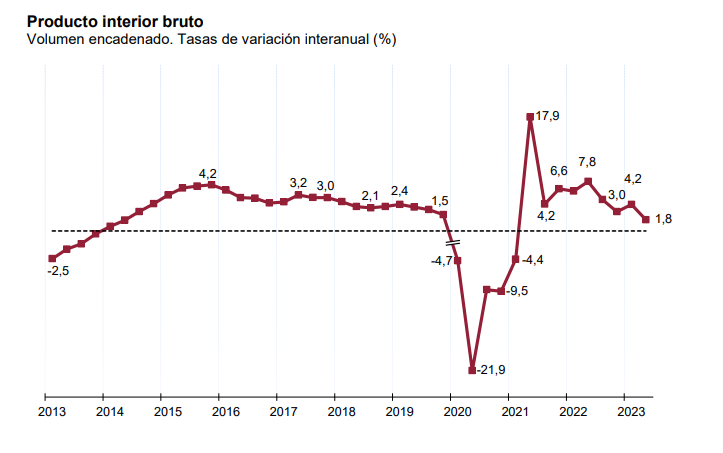 Экономика Испании выросла на 0,4% в период с апреля по июнь 2023 года, на одну десятую меньше, чем в предыдущем квартале, в то время как ее межгодовой темп роста замедлился с 4,2% в первом квартале до 1,8% во втором из-за меньшего вклада иностранного сектора.