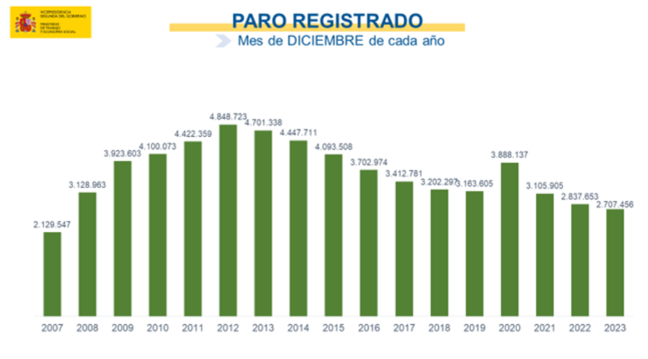 Численность безработных, зарегистрированных в органах государственной службы занятости Испании, снизилась по итогам декабря 2023 года на 27.375 человек по отношению к предыдущему месяцу (-1%), согласно данным, опубликованным сегодня Министерством труда и социальной экономики.