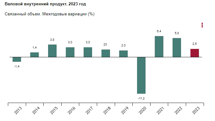 Таким образом, испанская экономика фиксирует третий год подряд рост в годовом выражении, хотя прошлогодние данные были самыми умеренными за этот период: в 2021 году ВВП вырос на 6,4%, в 2022 году - на 5,8%, а теперь темпы роста упали до 2,5%. В 2020 году наблюдалось историческое падение ВВП на 11,3%, вызванное пандемией коронавируса.