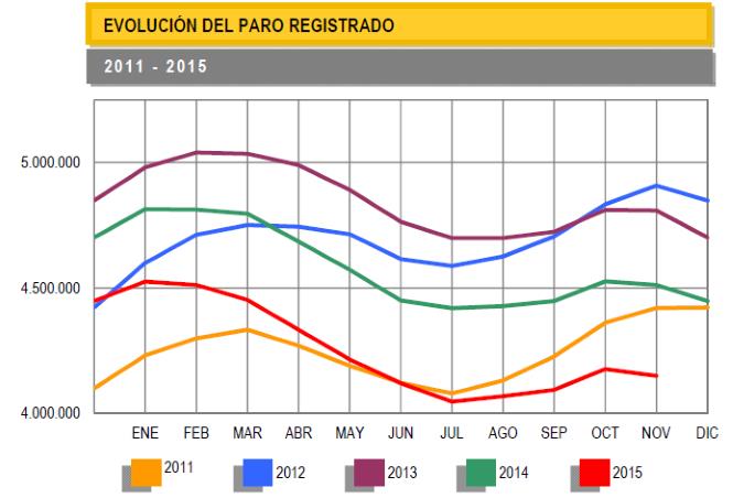 Ноябрь всегда был для Испании характерным месяцем, когда увеличивается число безработных. За последние восемь лет безработица в этом месяце росла, в среднем, на 52,340 человек, и за всю историческую серию в 11-м месяце только три раза было сокращение безработицы: в 2013 году (- 2.475 человек), в 2014 году (-14.688), а теперь это произошло в 2015 году (-27.071).