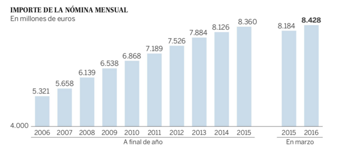 Выплата пенсий в марте обошлась системе социального страхования Испании в рекордную сумму в размере 8.427,9 миллионов евро, что на 2,99% больше по сравнению с аналогичным периодом прошлого года. За 10 последних лет объем средств на выплату пенсий вырос с 5.321млн. евро в 2006 году до вышеуказанной цифры.