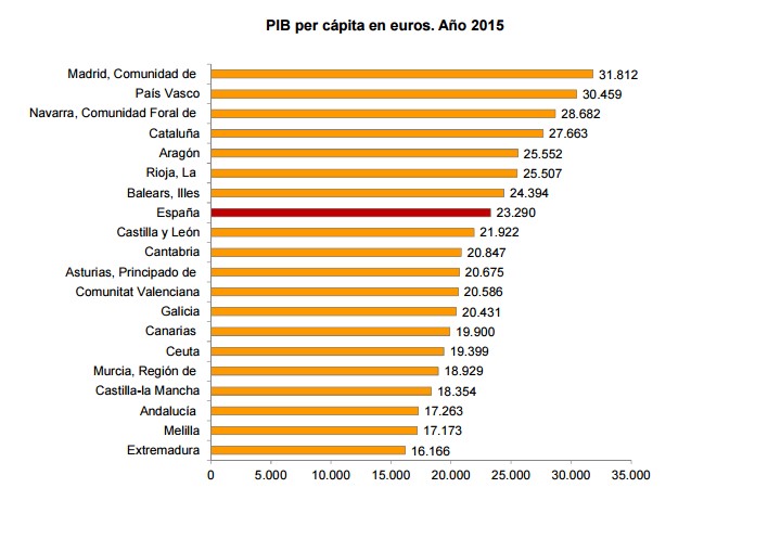 В противоположность этому, Эстремадура имеет самый низкий ВВП на душу населения с 16.166 евро, что на 30,6% меньше, чем в среднем по стране.