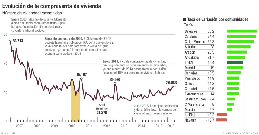 Продажи выросли во всех автономиях, за исключением Наварры и Ла Риохе, где произошло снижение числа сделок на 12,7% и 12,2%, соответственно. Наибольший годовой рост зафиксирован на Балеарских островах (+36,2%), в Каталонии (+34,4%) и в Кастилье - Ла Манче (+32,3%) Аутсайдерами в этом списке стали Кастилия и Леон (+9,4%), Валенсия (+8,0%) и Мурсия (+5,7%).