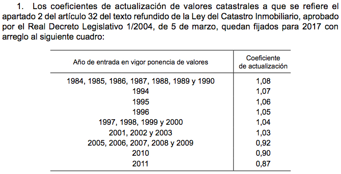 Правительство Испании в опубликованном в среду в официальном бюллетене (BOE) представило новые значения коэффициентов кадастровой стоимости жилья для 2 452 муниципалитетов страны, величина которых определяет оценочную стоимость недвижимости и непосредственно влияет на уплачиваемый на них налог (IBI). Данное нововведение будет действовать, начиная с 2017 года.