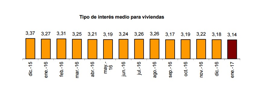 Средняя банковская ставка по ипотеке составила в январе 3,14%, что на 3,9% меньше прошлогоднего показателя этого месяца, тогда она составляла 3,27%. 63,2% ипотек было выдано под плавающий процент, который зависит от европейской межбанковской ставки предложения (Euribor), и 36,8% - под фиксированный.