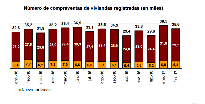 На рынок вторичного жилья пришлось 81,9% от общего числа сделок купли-продажи февраля 2017 года, где было продано 29.171 объектов с годовым ростом 6,1%. В данном сегменте рост наблюдается уже 36 месяцев подряд, а показатели продаж в нем достигают отметок, которых не наблюдалось с 2007 года. С другой стороны, продажи новостроек уменьшилось за год на 16,3%, до 6.439 операций. Это самый низкий показатель с января прошлого года.