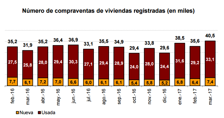 На рынок вторичного жилья пришлось 81,8% от общего числа сделок купли-продажи марта 2017 года, где было продано 33.100 объектов с годовым ростом 28,3%. В данном сегменте рост наблюдается уже 37 месяцев подряд, а показатели продаж в нем достигают отметок, которых не наблюдалось с сентября 2007 года. С другой стороны, продажи новостроек увеличилась за год на 21,2%, до 7.361 операций. Это самый высокий показатель с февраля прошлого года.