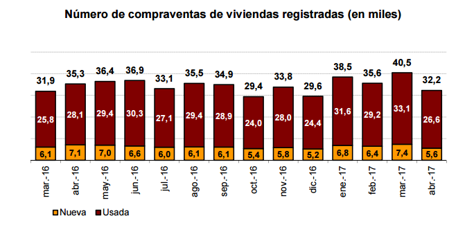 На рынок вторичного жилья пришлось 82,6% от общего числа сделок купли-продажи апреля 2017 года, где было продано 26.629 объектов. В данном сегменте, который был локомотивом восстановления в жилищном секторе страны, зафиксировано годовое снижение на 5,35% после непрерывного роста 37 месяцев подряд. С другой стороны, продажи новостроек упали за год на 21,5%, до 5.598 операций.