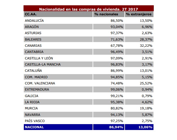 В трёх автономных сообщества доля покупок жилья иностранцами превысила 25%: Канарские острова – 32,2%, Балеарские острова – 28,4% и Валенсия – 25,52%. А менее всего зарубежных покупателей привлекает Астурия, чей вклад в общее число покупок иностранцами составил 2,63%, Эстремадура – 0,94% и Галисия – 0,79%.