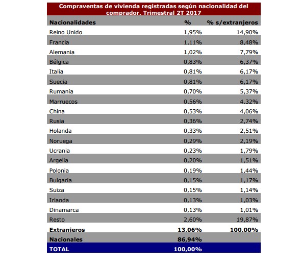 На долю жителей Великобритании пришлось 14,9% от общего объёма иностранных покупок жилья. За ними следуют французы (8,5%), немцы (7,8%), бельгийцы (6,4%), итальянцы и шведы (по 6,2%), румыны (5,4%) марокканцы (4,3%), китайцы (4,1%) и россияне (2,74%).