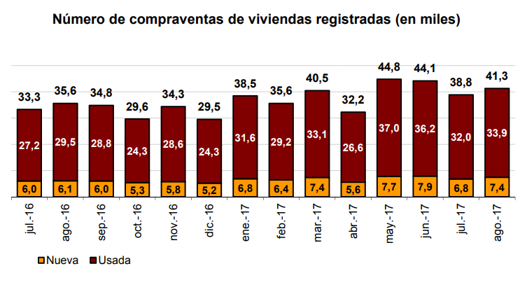 На рынок вторичного жилья пришлось 82,1% от общего числа сделок купли-продажи августа 2017 года, где было продано 33.886 объектов с годовым ростом 14,9%. С другой стороны, продажи новостроек увеличилась за год на 21,3%, до 7.396 операций.
