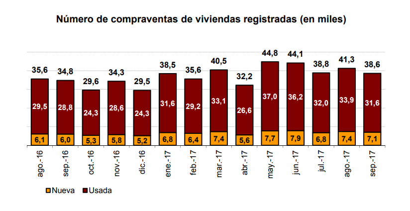 На рынок вторичного жилья пришлось 81,7% от общего числа сделок купли-продажи сентября 2017 года, где было продано 31.557 объектов с годовым ростом 9,6%. С другой стороны, продажи новостроек увеличилась за год на 17,7%, до 7.053 операций.
