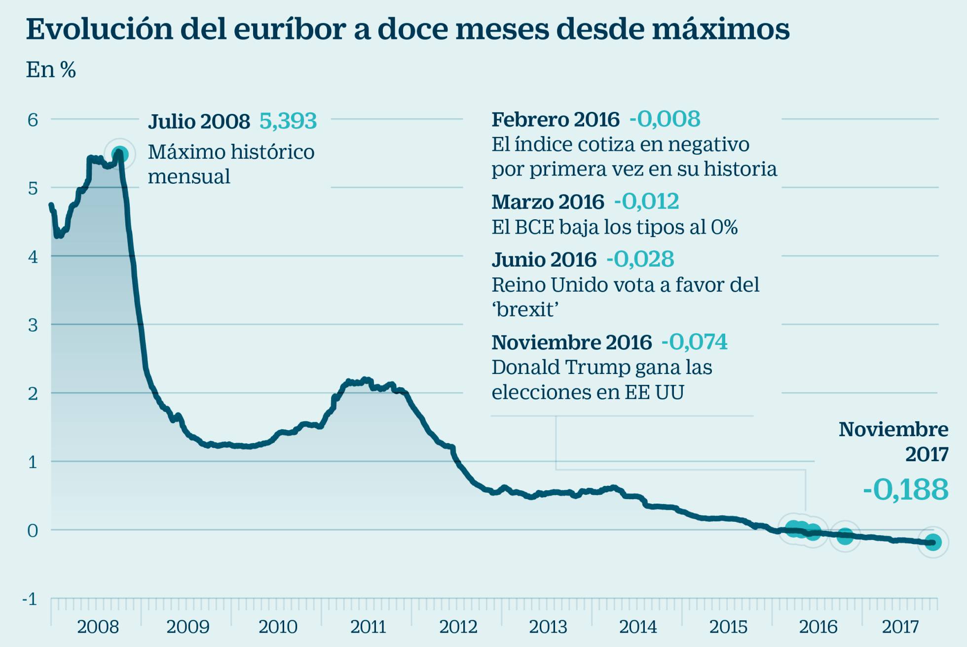 Европейская межбанковская ставка предложения Euribor (Euro Interbank Offered Rate), к которой привязано большинство ипотечных кредитов в Испании, по итогам ноября 2017 года снизилась до очередного исторического минимума, и составила минус 0,189%. В предыдущий месяц этот показатель составлял в среднем минус 0,180%.