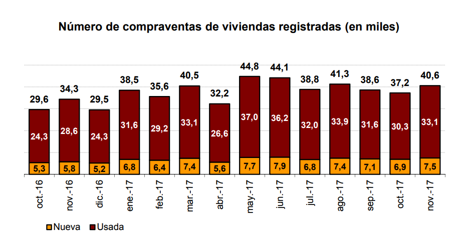 На рынок вторичного жилья пришлось 81,6% от общего числа сделок купли-продажи ноября 2017 года, где было продано 33.100 объектов с годовым ростом 15,8%. С другой стороны, продажи новостроек увеличилась за год на 29,8%, до 7.479 операций.