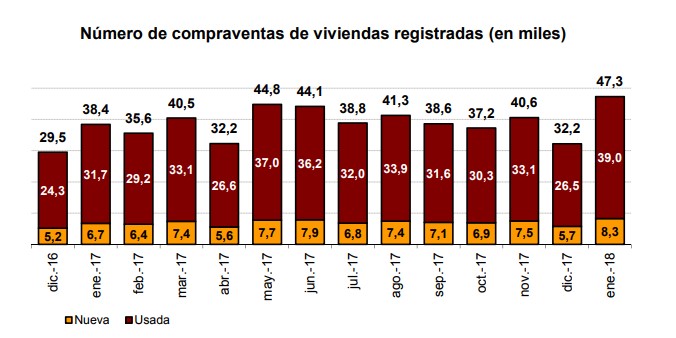 На рынок вторичного жилья пришлось 82,5% от общего числа сделок купли-продажи января 2018 года, где было продано 39.017 объектов. Годовой рост этого сегмента составил 23%. С другой стороны, продажи новостроек увеличилось на 23,5%, до 8.272 операций.