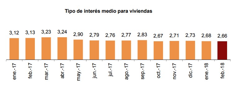 Средняя банковская ставка по ипотеке составила в феврале 2,66%, что на 15,3% меньше прошлогоднего показателя этого месяца, тогда она составляла 3,13%. 62,4% ипотек было выдано под плавающий процент, который зависит от европейской межбанковской ставки предложения (Euribor), и 37,6% - под фиксированный.