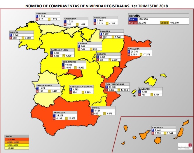 Самое высокое количество продаж жилья за первый квартал было зарегистрировано в таких автономных сообществах, как Андалусия (24 208), Каталония (20 756), Валенсия (19 876) и Мадрид (18 855).