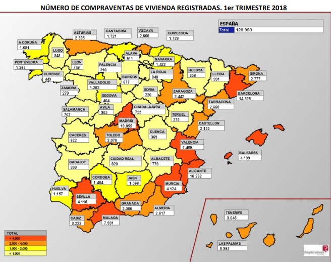 Что касается испанских провинций, то в 45-ти из них произошло квартальное увеличение числа продаж жилья, а в 33-х - увеличение было двухзначное. Наибольшее количество проданного жилья было зарегистрировано в Мадриде (18 855), Барселоне (14 328), Аликанте (10 232), Малаге (7 931) и Валенсии (7 489).