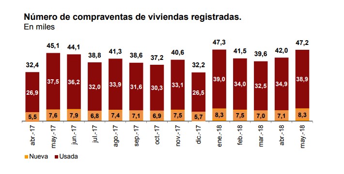 На рынок вторичного жилья пришлось 82,4% от общего числа сделок купли-продажи мая 2018 года, где было продано 38.874 объекта с годовым ростом 3,7%. С другой стороны, продажи новостроек увеличились за год на 9,2%, до 8.303 операций.